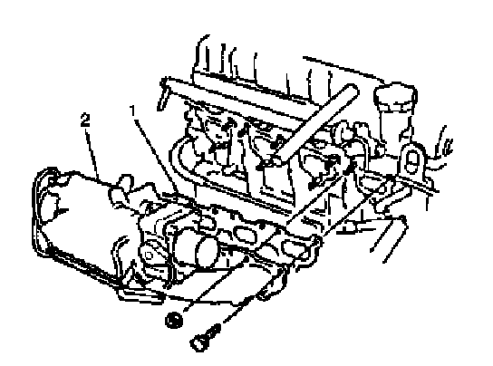 2. Install intake manifold (2) with throttle body. Tighten bolts and nuts to specified torque.