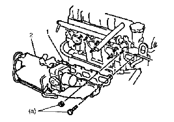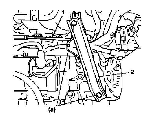 3. Connect coolant pipe (1) to intake manifold and install rear stiffener (2). Tighten bolts to specified torque.