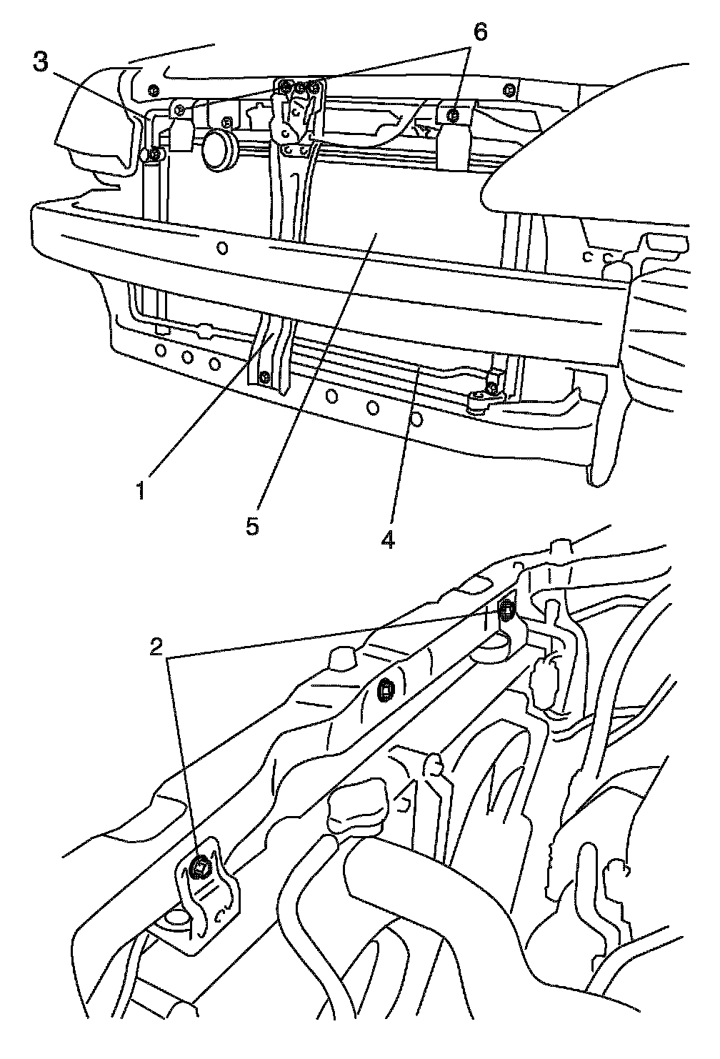 4. Remove hood lock cross member (1) and radiator stay bolts (2).