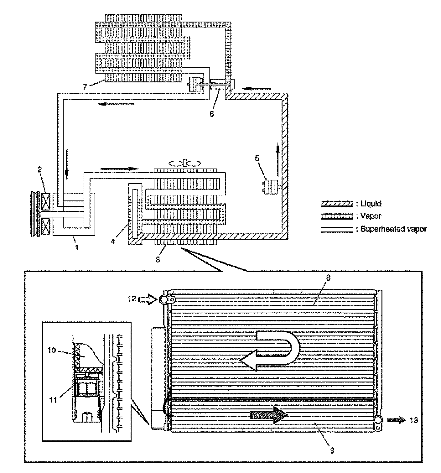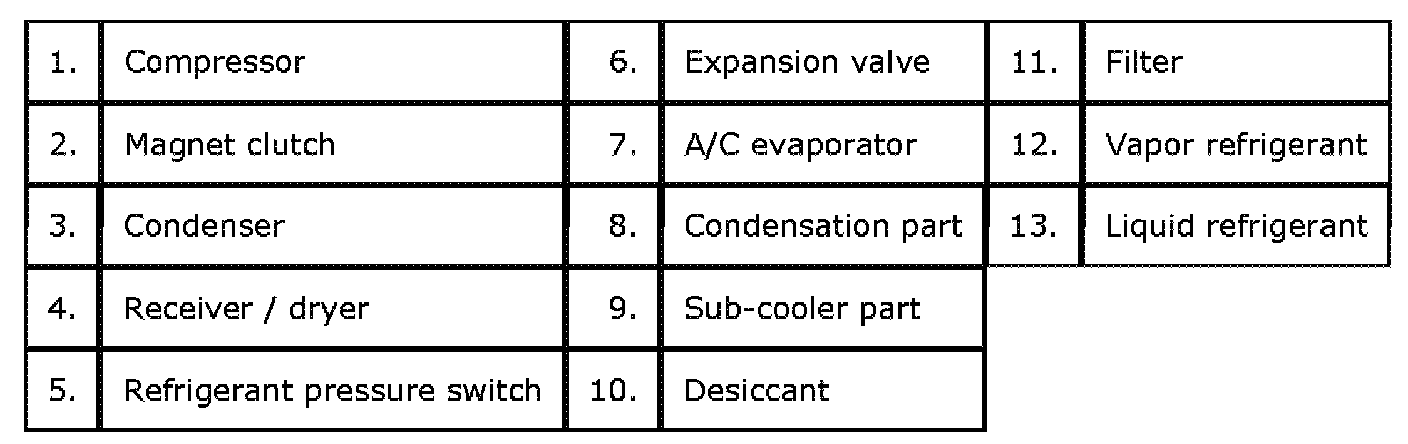 Sub-Cool System DescriptionIn the sub-cool A/C system (condenser integrated with receiver / dryer), the inside of the condenser is divided into the condensation part and the sub-cooler part, and the receiver / dryer is located between those. In the receiver / dryer, the refrigerant is separated into the vapor refrigerant and the liquid refrigerant. Only the liquid refrigerant is delivered to the subcooler part of the condenser. The refrigerant is supercooled by the sub-cooler part of the condenser.