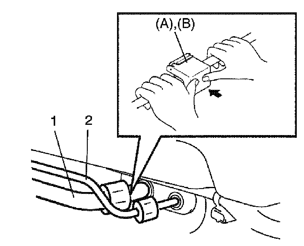 4. Disconnect suction pipe (1) and condenser outlet pipe (2) using special tools.