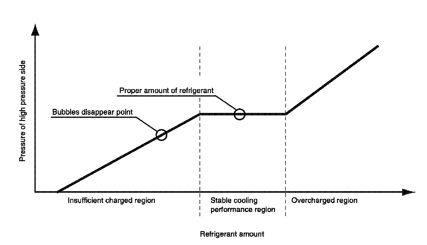 Because, in the sub-cool system, the point at which bubbles disappear is in insufficient charged region, the amount of refrigerant will be insufficient if the refrigerant charge is stopped at the point at which bubbles disappear. Also, overcharge causes poor performance of the A/C system and poor fuel consumption.