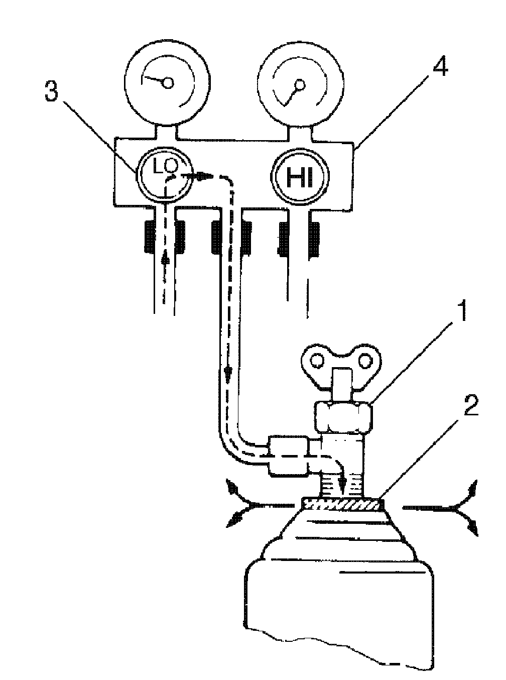 a. Retract needle (3) and remove refrigerant container tap valve (2) by loosening its plate nut (4).