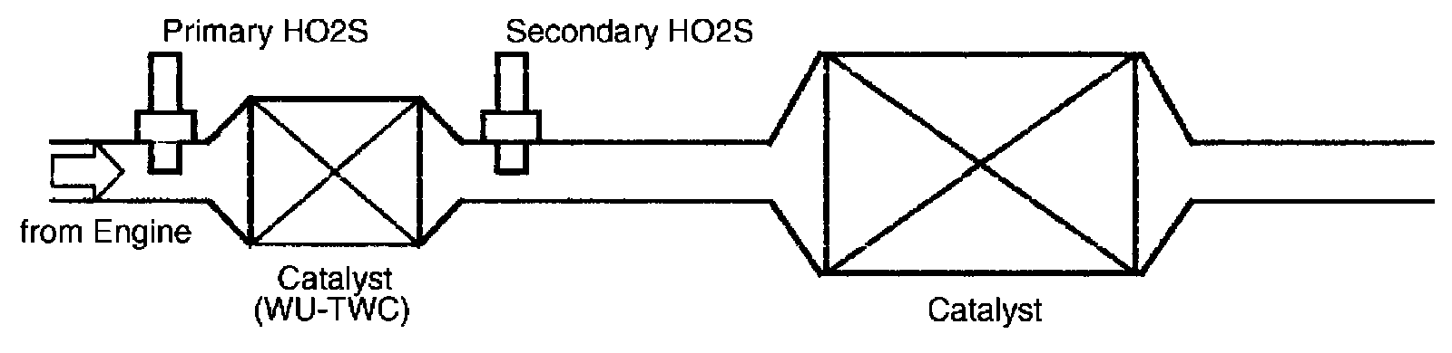 The system has 2 oxygen sensors located upstream and downstream of the catalysts. The layout of catalysts and oxygen sensors is described below.