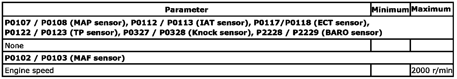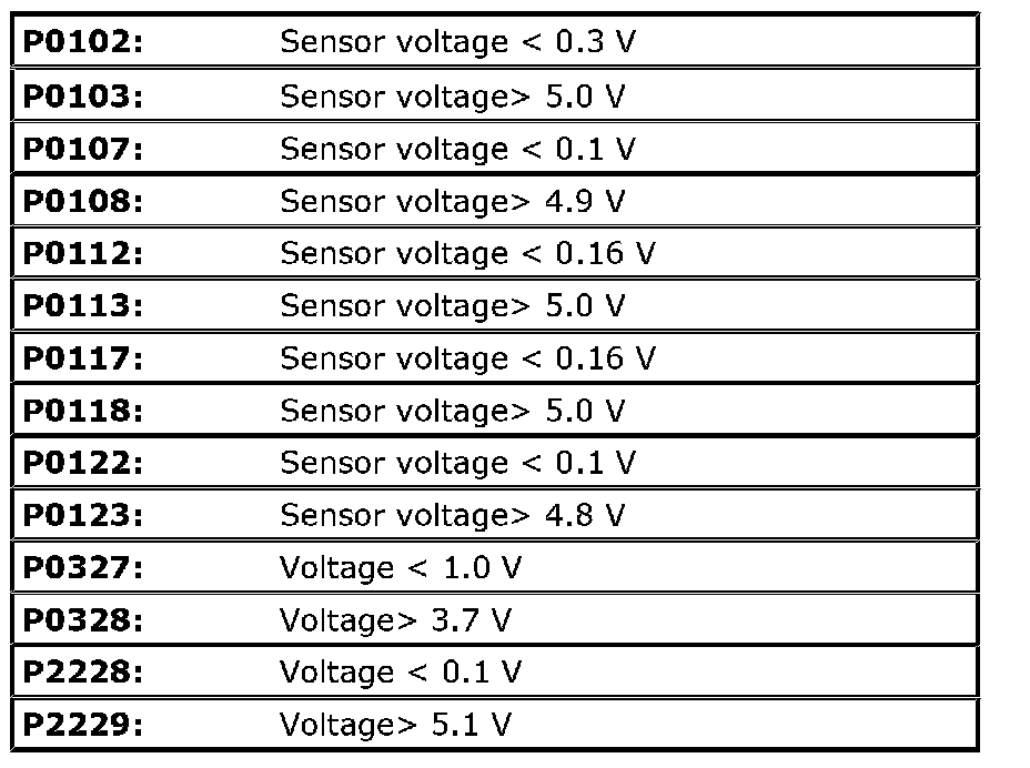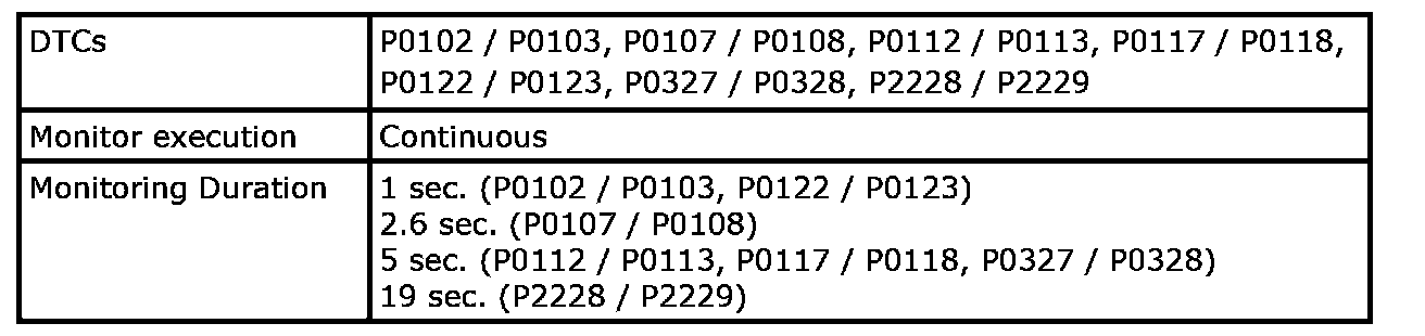 Input signals of MAF (P0102 / P0103), MAP (P0107 / P0108), IAT (P0112 / P0113), ECT (P0117 / P0118), TP (P0122 / P0123), Knock sensor (P0327 / P0328) and Barometric pressure sensor (P2228 / P2229) are checked for open, short of circuit by monitoring input voltage.