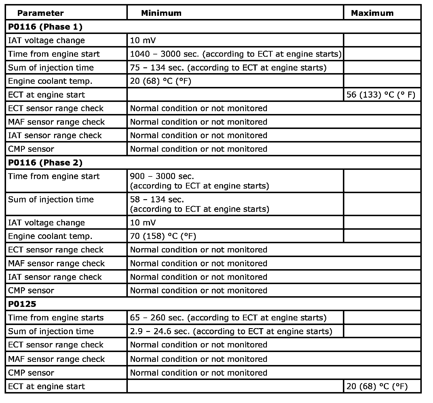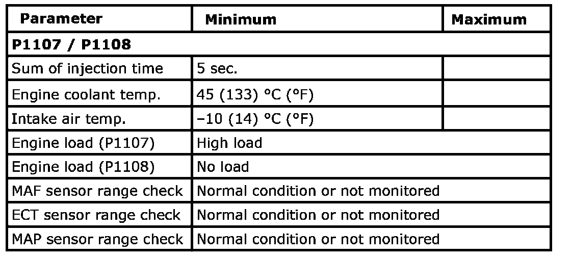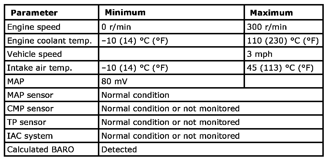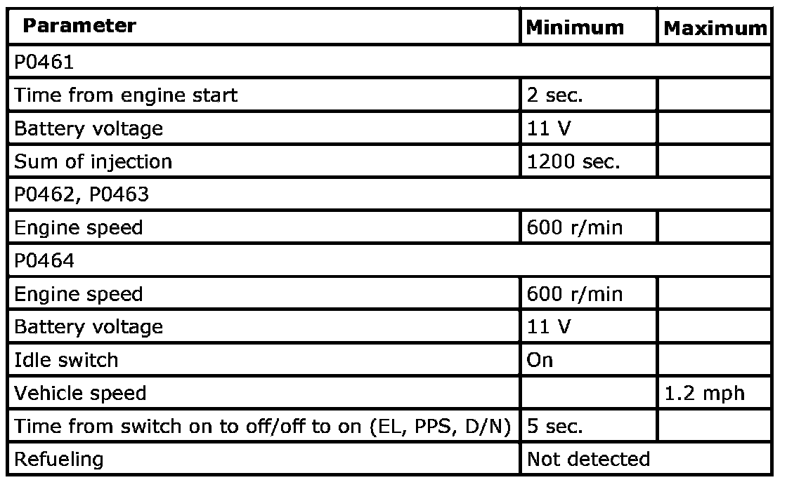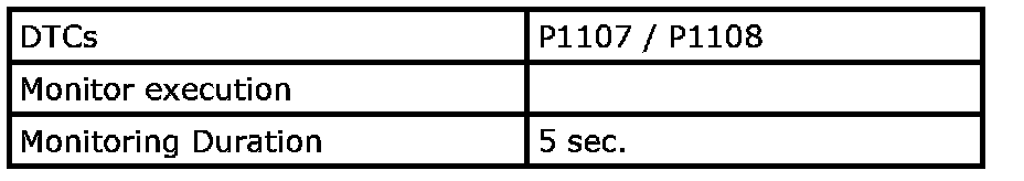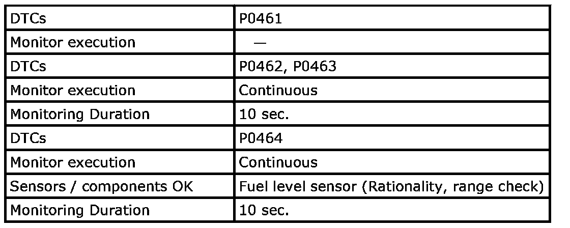Input signal of MAF (P0101), IAT (P0111), ECT (P0116, P0125), TP (P0121), CKP (P0335), CMP (P0340), Fuel level sensor (P0461, P0462, P0463, P0464), VSS (P0500), ECM internal circuit/memory (P0601, P0607, P0630, P1510), Starter (P0616, P0617), MAP (P1107, P1108), Barometric pressure sensor (P2227) are checked for circuit rationality by monitoring each sensor and vehicle condition.