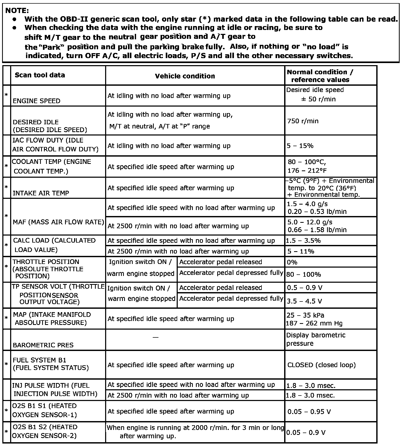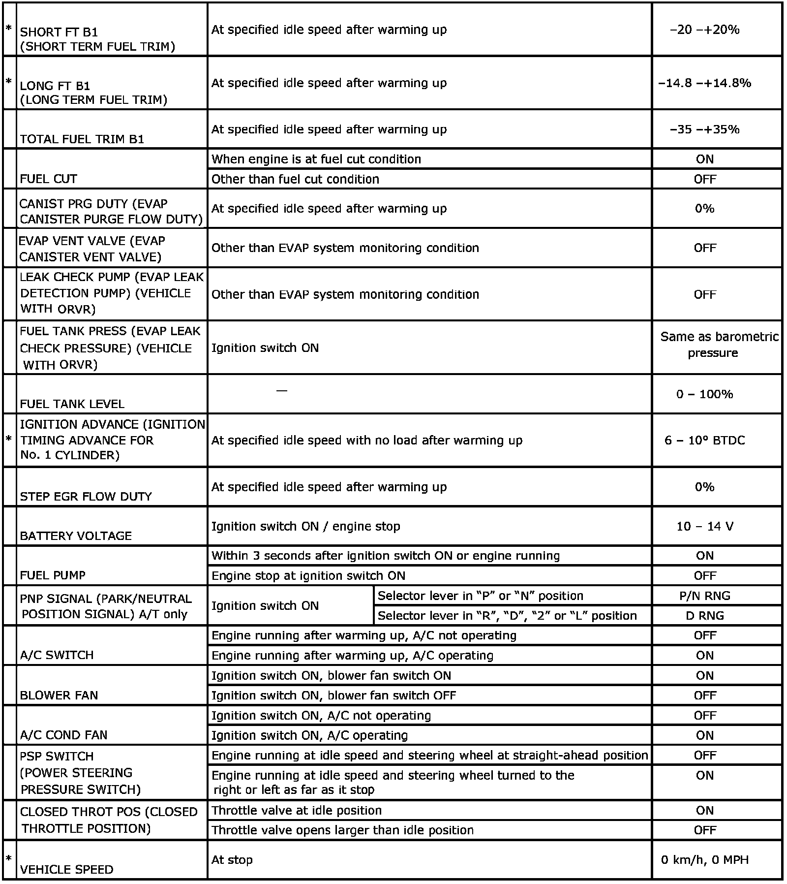 As the data values are standard values estimated on the basis of values obtained from the normally operating vehicles by using a scan tool, use them as reference values. Even when the vehicle is in good condition, there may be cases where the checked value does not fall within each specified data range. Therefore, judgment as abnormal should not be made by checking with these data alone.