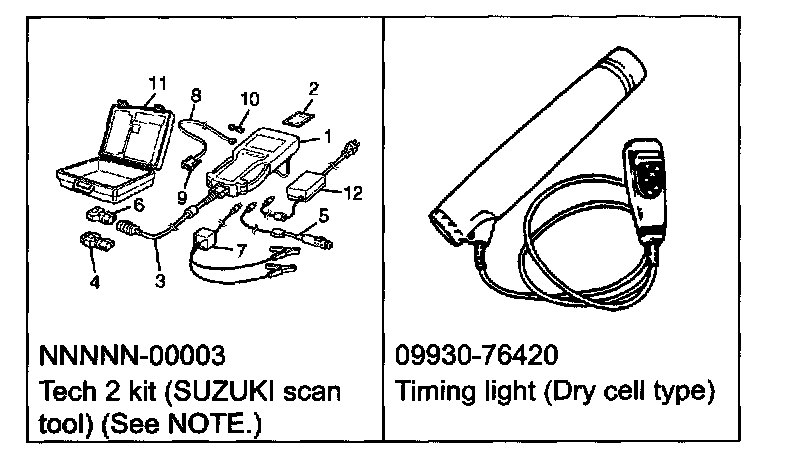 1. Tech 2, 2. PCMCIA card, 3. DLC cable, 4. SAE 16/19 adapter, 5. Cigarette cable, 6. DLC loopback adapter, 7. Battery power cable, 8. RS232 cable, 9. RS232 adapter, 10. RS232 loopback connector, 11. Storage case, 12. Power supply