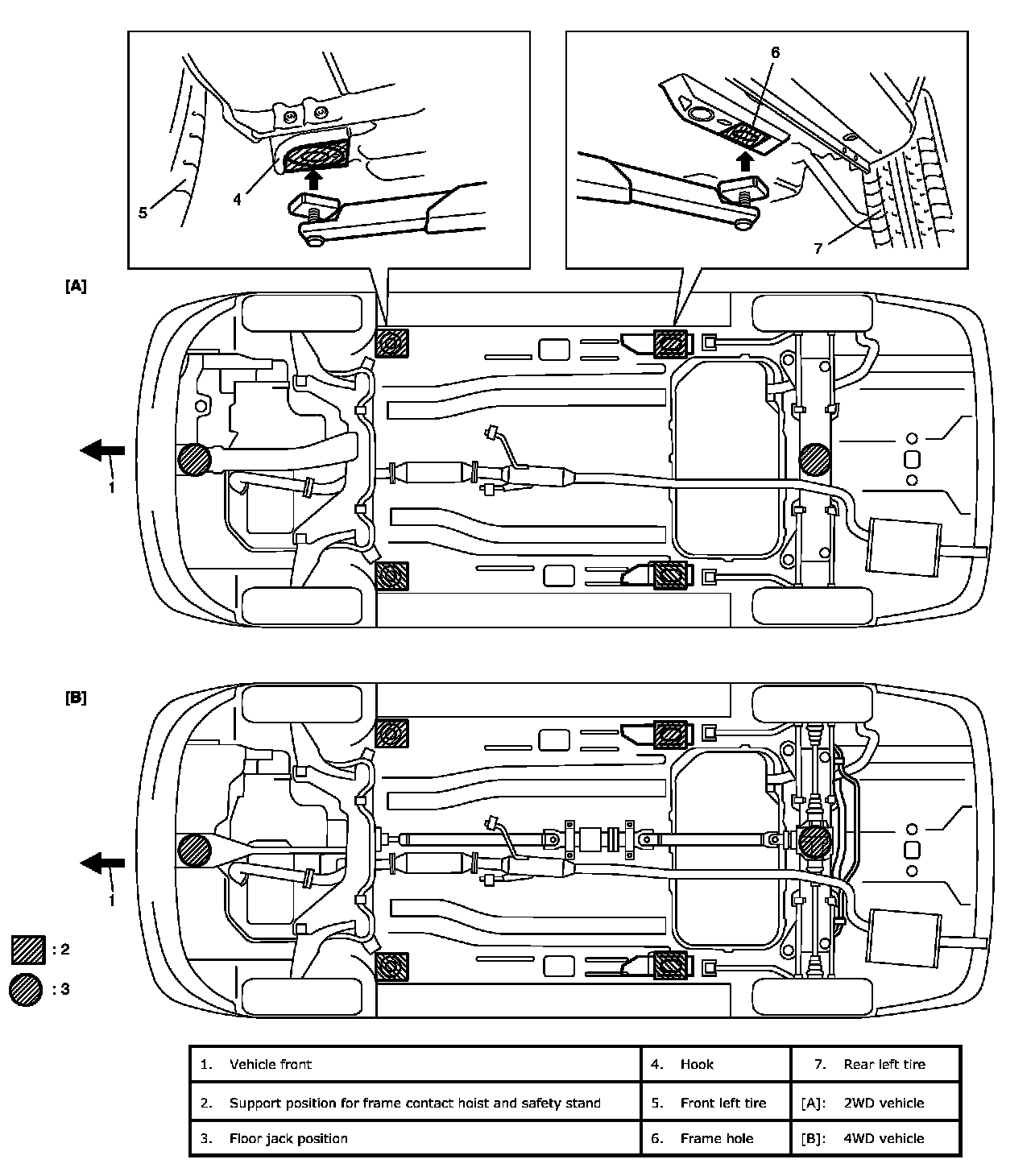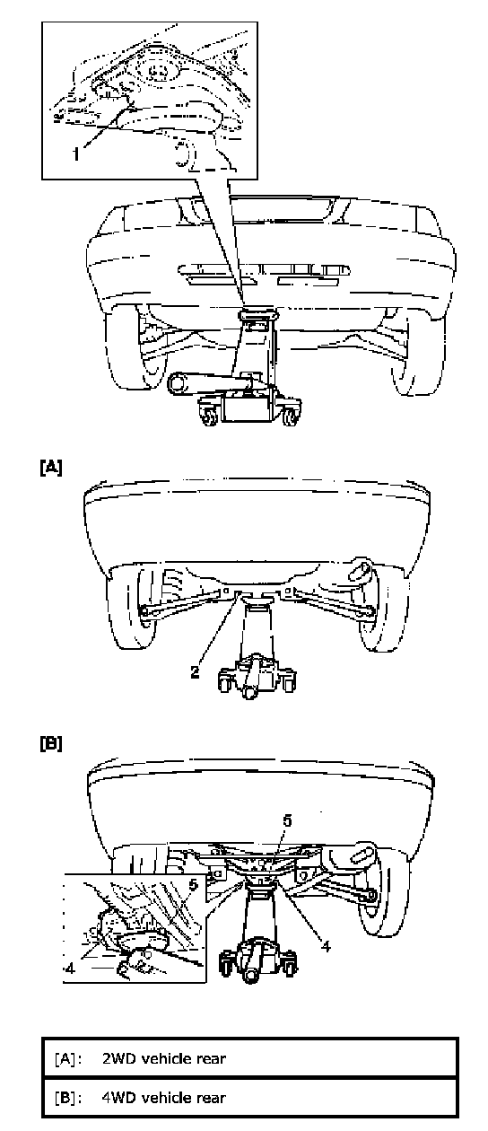 CAUTION: Never apply jack against suspension parts (i.e., stabilizer, suspension frame (5) etc.) or vehicle floor, or it may get deformed.