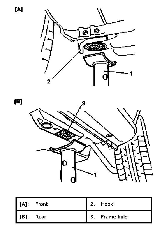 - When using frame contact hoist, apply hoist as shown (right and left at the same position). Lift up the vehicle till 4 tires are a little off the ground and make sure that the vehicle will not fall off by trying to move vehicle body in both ways. Work can be started only after this confirmation.