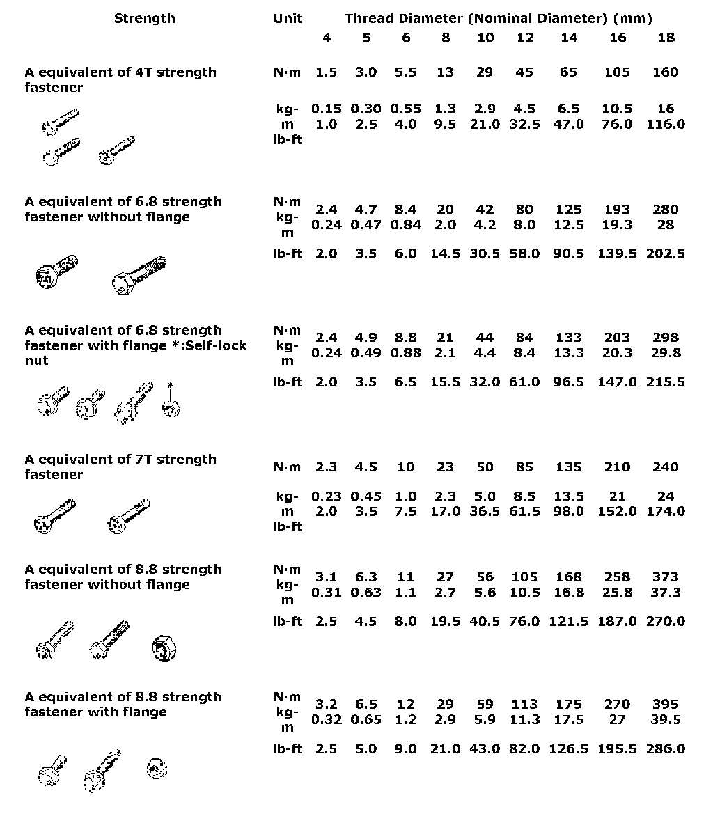 Standard Tightening TorqueEach fastener should be tightened to the torque specified in each section of this manual. If no description or specification is provided, refer to the following tightening torque chart for the applicable torque for each fastener. When a fastener of greater strength than the original one is used, however, use the torque specified for the original fastener.