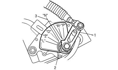 2. Shift manual shift lever (1) to "N" range (transmission range sensor "N" range) aligning arrow (2) of lever (1) with "N" reference line (3).