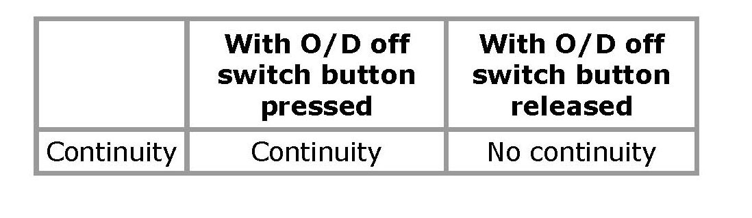 Check continuity between O/D off switch (2) terminals. If check result is not as satisfied, replace switch.