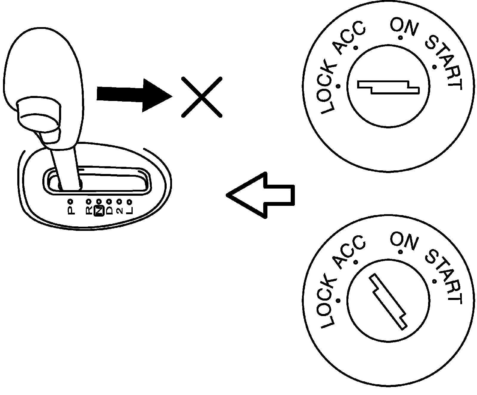 3) With ignition lever shifted to any position other than "P" range, check that ignition key cannot be turned LOCK position and it cannot be removed from ignition switch unless it is at LOCK position.