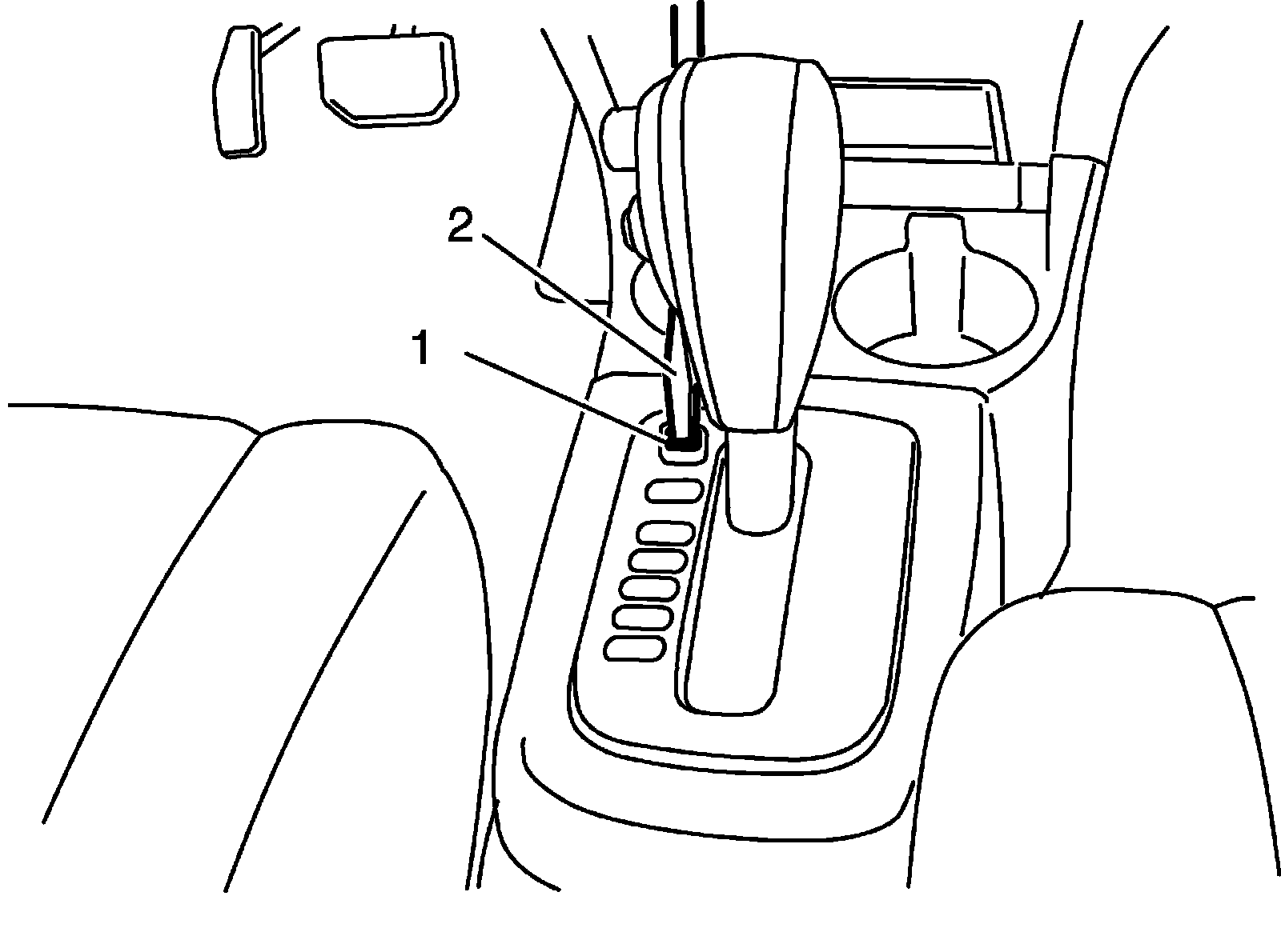 ^ With shift lock solenoid release button (1) pushed using flat end rod (2) or like and ignition key turned to ACC position, selector lever can be shifted from "P" range position to any other range.