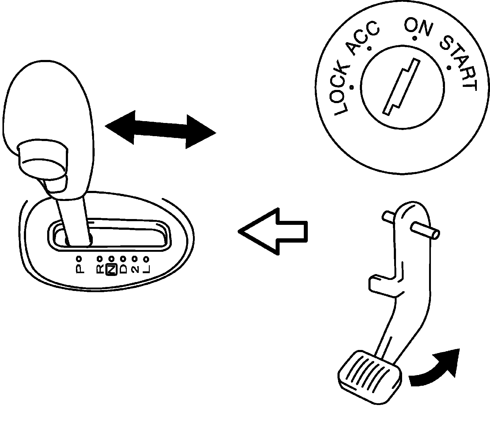 Brake Interlock System Inspection1) Check that selector lever cannot be moved to any other range from "P" range position when ignition switch key is at ACC position, at LOCK position (or it is removed from keyhole of ignition switch) or brake pedal is not depressed.