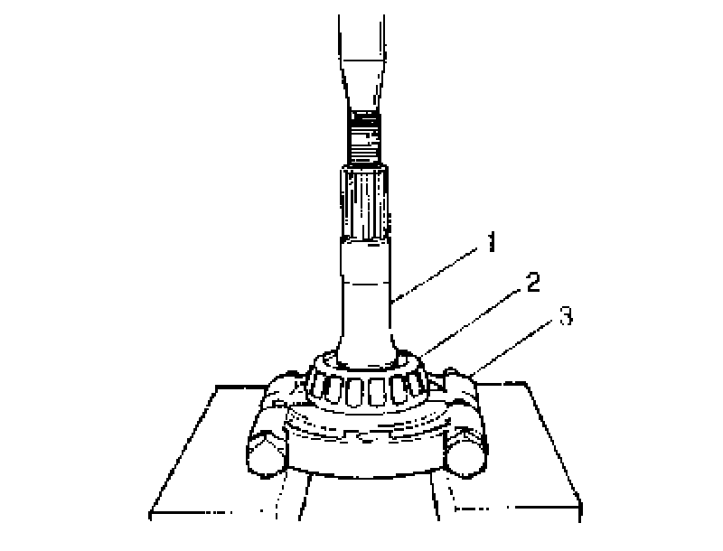 12. Remove rear bearing (2) from drive bevel pinion (1) by using bearing puller (3) and press.