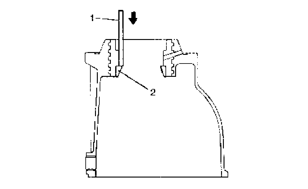 13. Using a hammer and brass bar (1), drive out front bearing outer race (2).