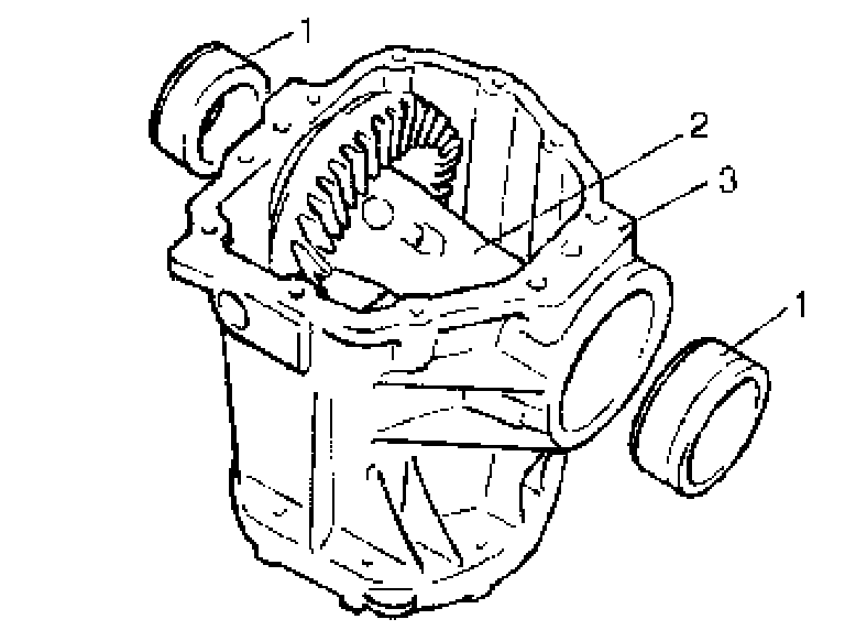 3. After applying differential oil to side bearings, install case assembly (2) in differential carrier (3).