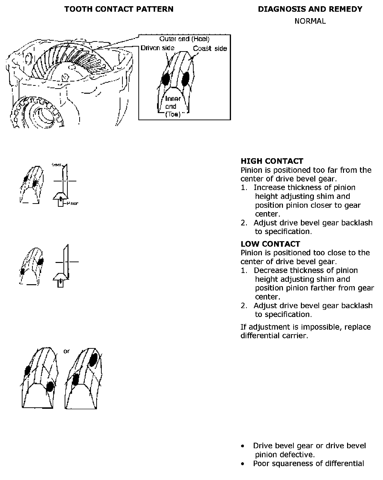 Apply red lead paste to tooth of drive bevel gear and turn it by hand to check its contact with drive bevel pinion. Check contact pattern, referring to following chart. If contact pattern is not normal, readjust or replace as necessary according to instruction in chart.