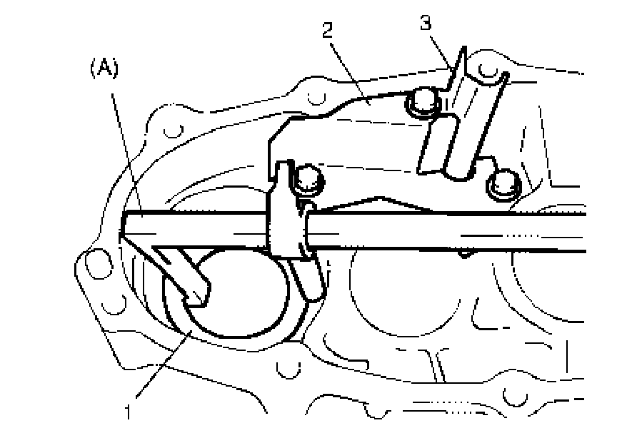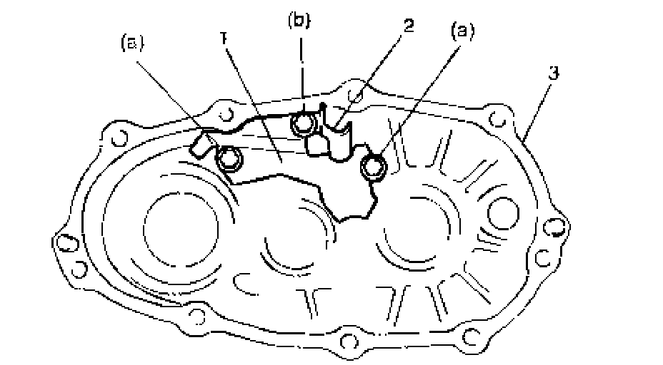 2. Install adjuster plates (2) to transfer right and left case so as one side of plate claw to touch dent wall of bevel gear adjuster (3) as shown in figure to prevent bevel gear adjusters (3) from loosing.