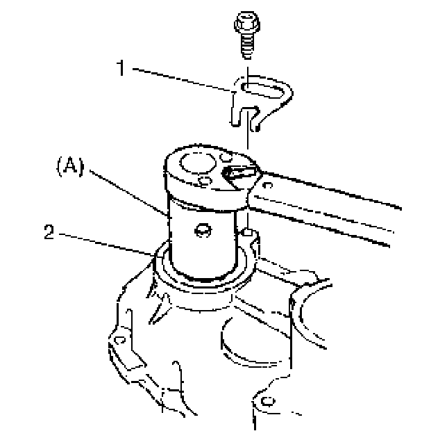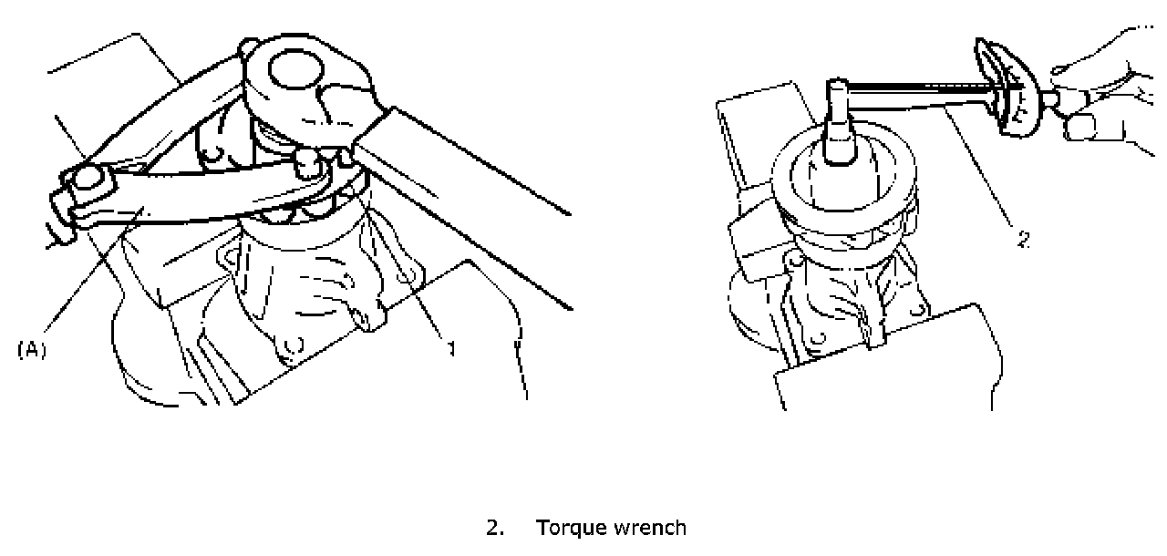 1. Screw bevel gear adjuster (1) on right case by using special tool while measuring starting torque of reduction drive gear (i.e., preload of reduction idler gear and driven gear taper roller bearings) by using special tool and torque wrench (2) until corrected starting torque value of reduction drive gear is in specified value shown as follows.