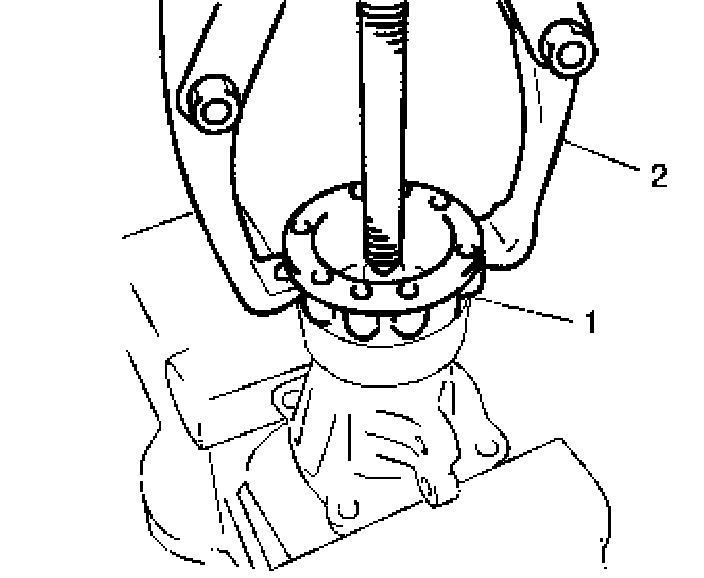 1. Drive out bearings of reduction drive gear, reduction idler gear and reduction driven gear by using bearing puller (1) and hydraulic press (2).