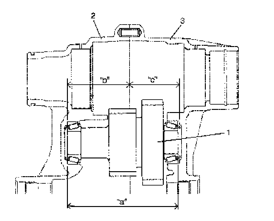 1. Measure distance "a" between taper roller bearing outer races of reduction idler gear (1).