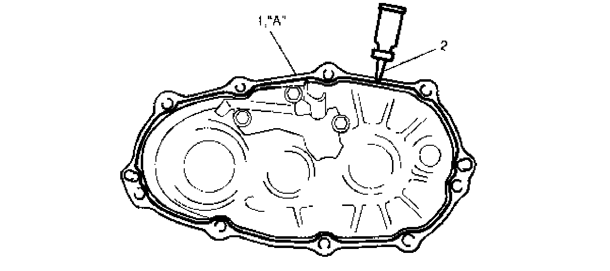 1. Clean mating surface of right and left cases, and apply sealant to right case (1) by using a nozzle (2) as shown in figure by such amount that its section is 1.2 mm (0.047 inch) in diameter.