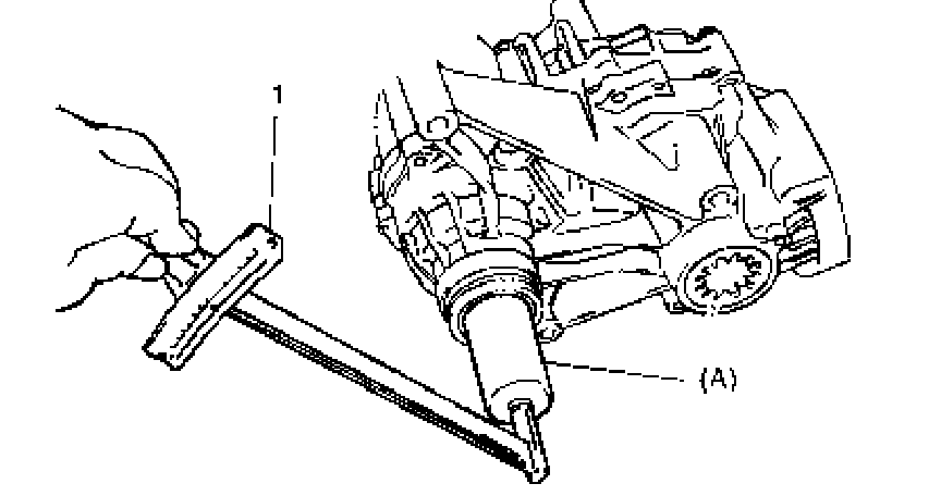 4. Drive out bevel pinion shaft (1) from transfer output retainer by tapping it with plastic hammer (2).