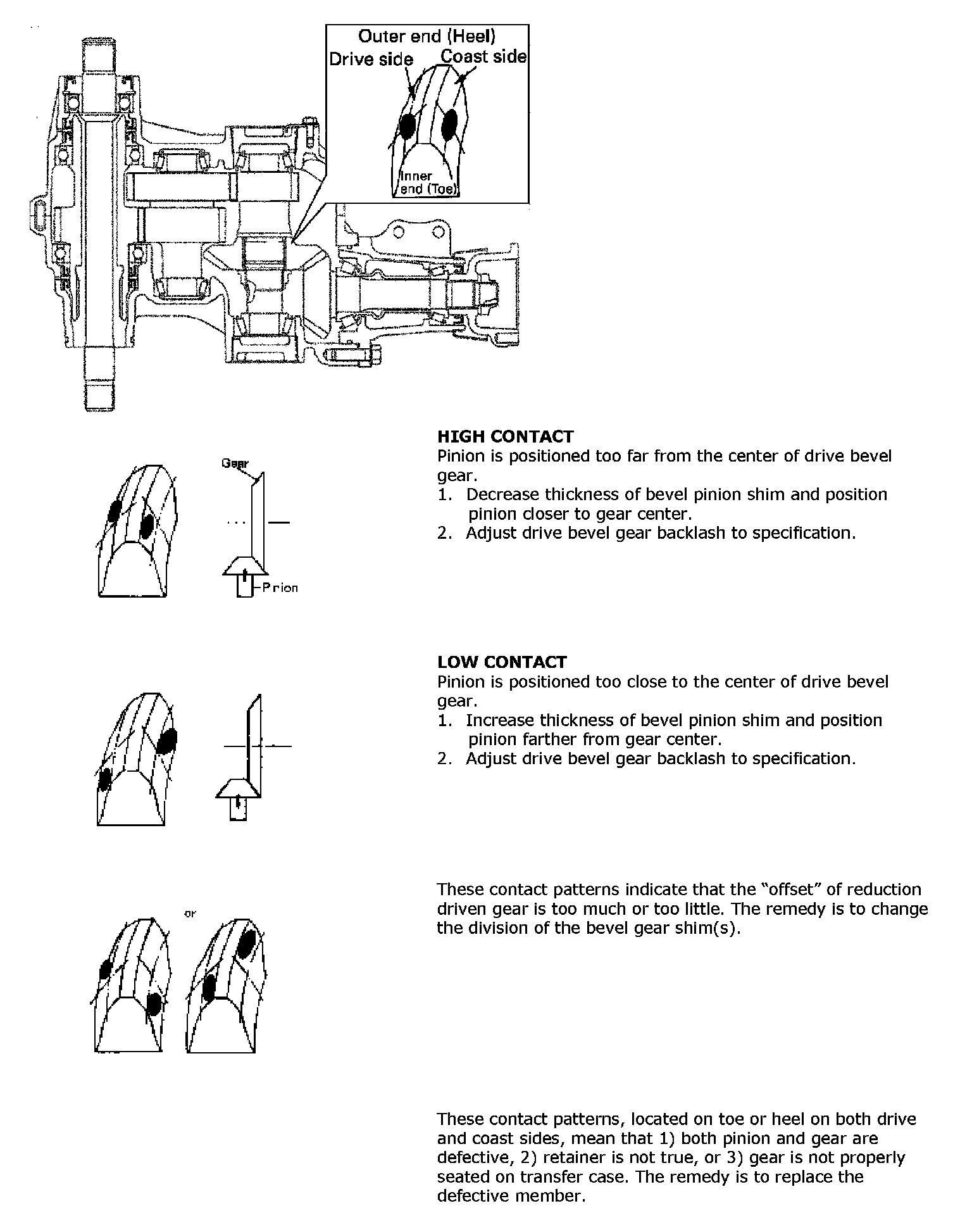 ^ If bevel gear back lash and bevel pinion shims are adjusted properly, correct tooth contact should be provided. If correct tooth contact is not provided even when they are adjusted properly, however, there may be an abnormal condition in worn tooth, transfer case or retainer. Check each component and replace as necessary.