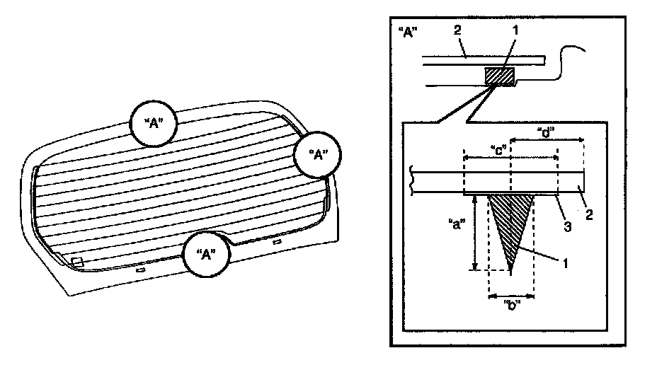 - Observe the following precautions when applying adhesive (1) along glass (2) edge.
