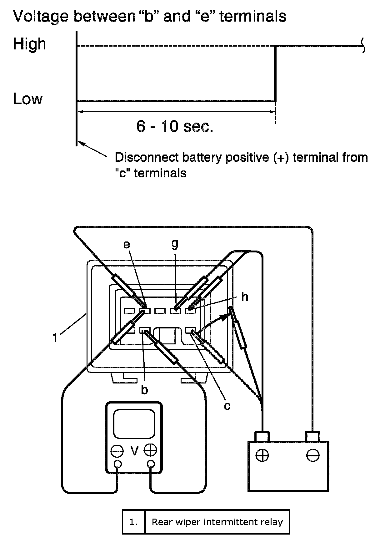 d. Check that voltage between "b" and "e" terminals changes as in the figure when disconnecting battery positive (+) terminal from "c" terminal.