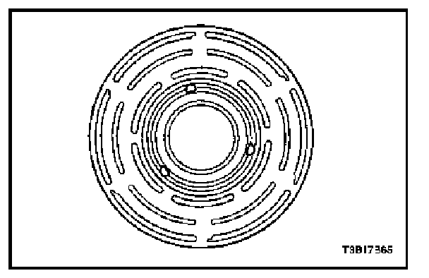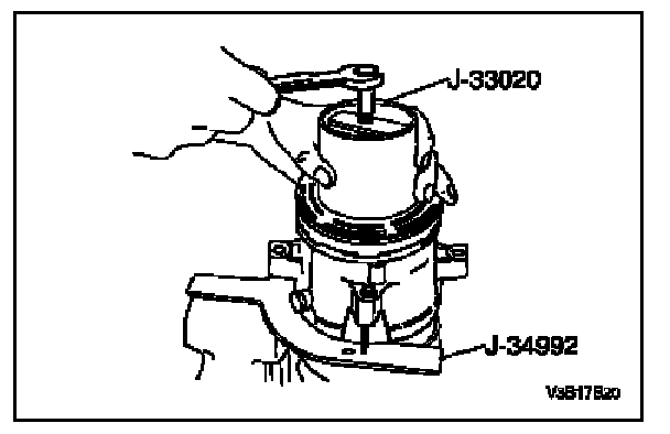 6. With the compressor mounted to the compressor holding fixture J-34992, install the pulley puller J-33020 into the inner circle of slots in the pulley rotor. Turn the pulley puller J-33020 clockwise in the slots to engage the puller tangs with the segments between the slots in the rotor.