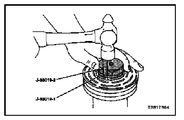 2. Align the new bearing squarely in the pulley bore. Use the bearing installer J-9481 and the driver handle J-8092, drive the bearing fully into the pulley bore.