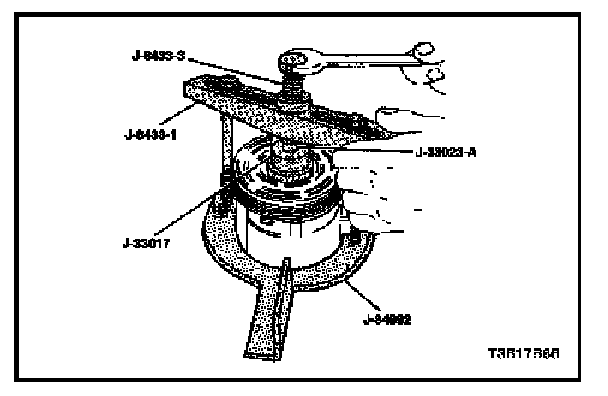 7. Position the puller crossbar J-8433-1 center forcing bolt on the puller pilot J-33023-A and assemble the two through-bolts and the washers through the slots on the puller crossbar J-8433-1. Thread the through-bolts into the holding fixture J-34992. The thread of the through-bolts should engage the full thickness of the fixture.