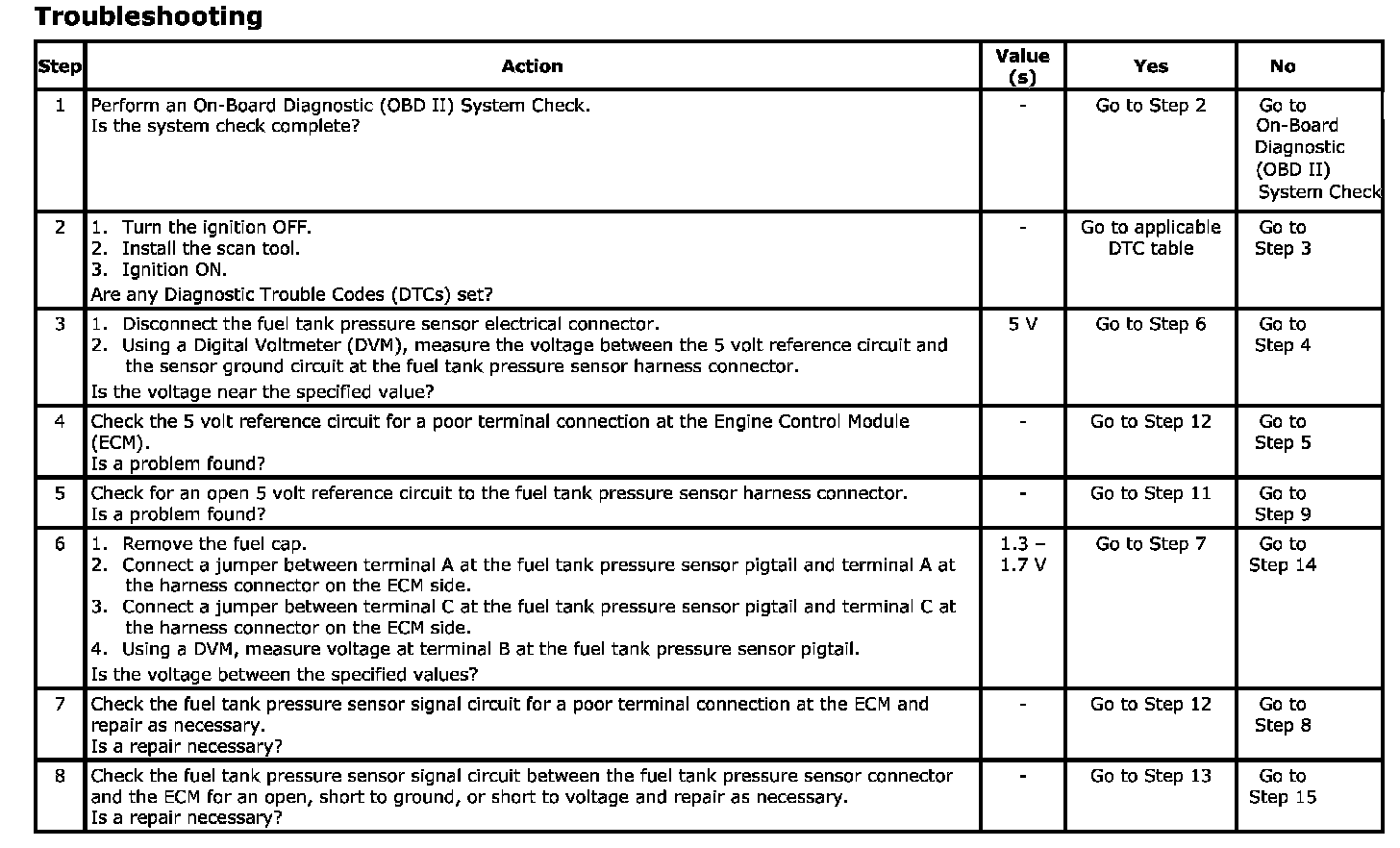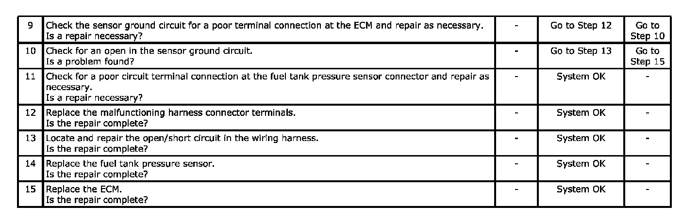 ^ Damaged harness. Inspect the wiring harness for damage. If the harness appears to be OK, observe the Fuel Tank Vacuum Pressure display on the scan tool while moving connectors and wiring harnesses related to the sensor. A change in the display will indicate the location of the fault.