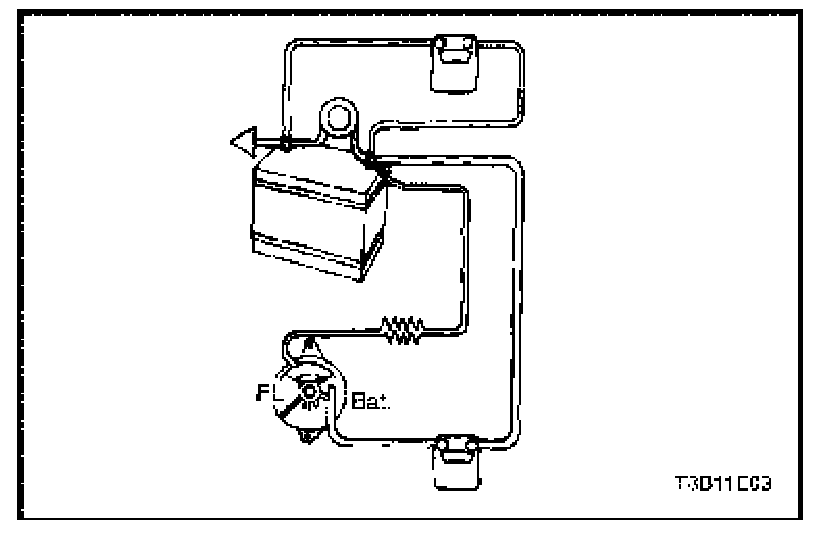 13. With the generator operating at the maximum output, measure the voltage between the generator housing and the battery negative terminal. The voltage drop should be 0.5 volt or less. If the voltage drop is more than 0.5 volt, check the ground path from the generator housing to the negative battery cable.