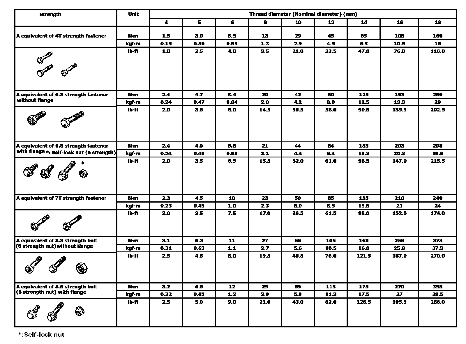 ^ For the flanged bolt, flanged nut and self-lock nut of 4T and 7T strength, add 10% to the tightening torque given in the following chart.