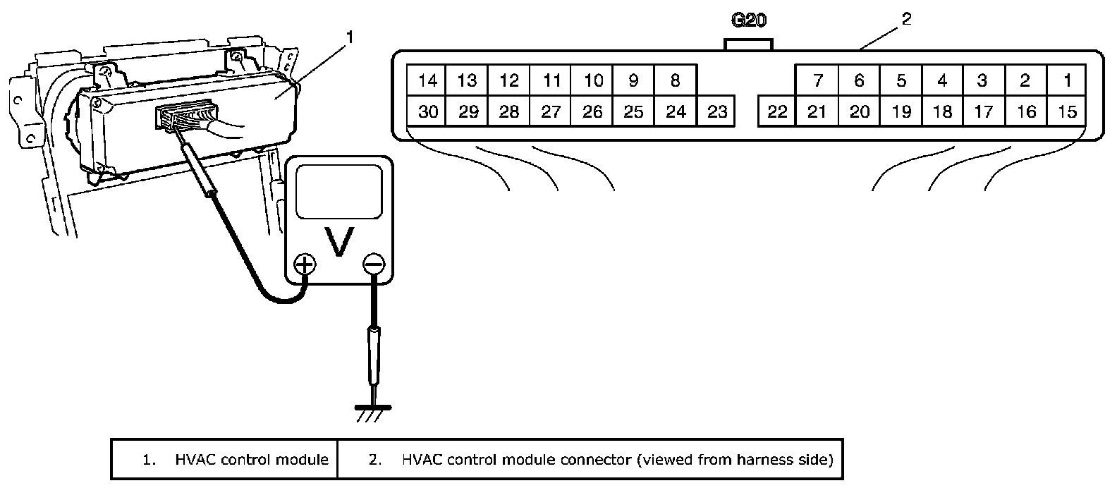 CAUTION: HVAC control module can not be checked by itself. It is strictly prohibited to connect voltmeter to HVAC control module with couplers disconnected from it.
