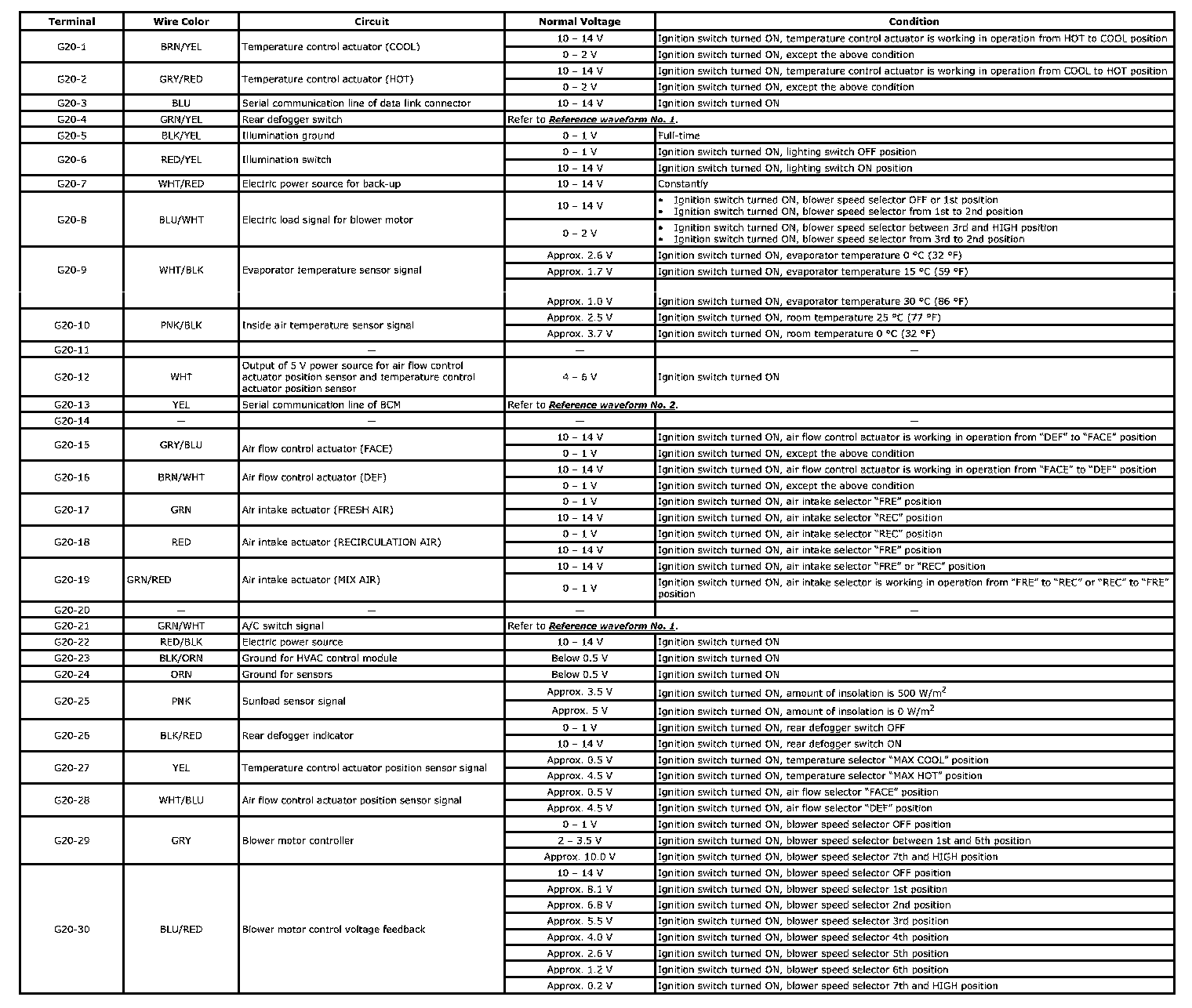 NOTE: As each terminal voltage is affected by the battery voltage, confirm that it is 11 V or more when ignition switch is ON.
