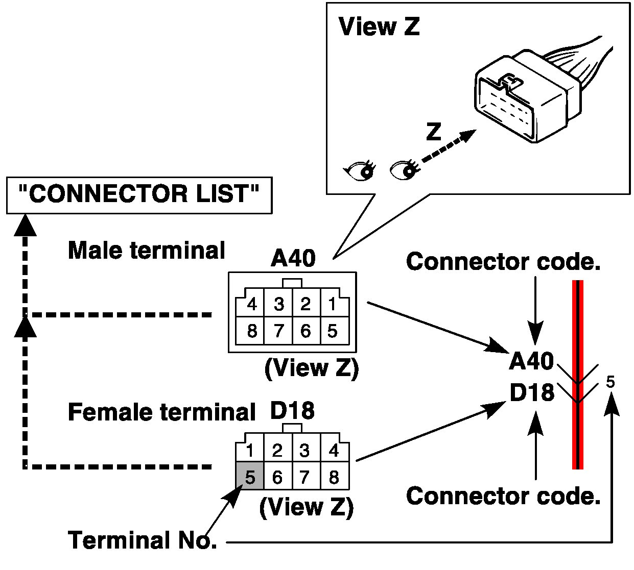 ^ The connector shape and terminal layout shown in this manual are those when viewed from "Z" in the illustration.