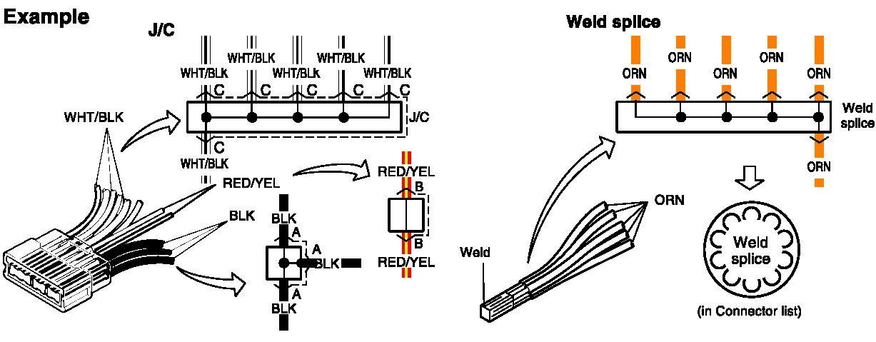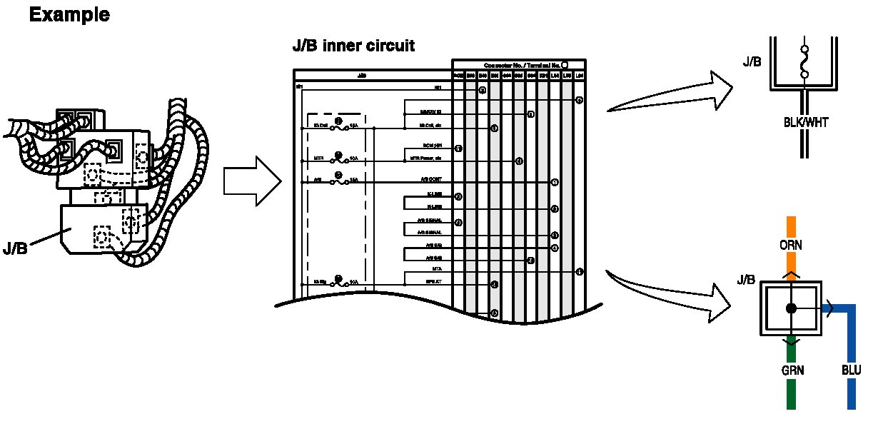 ^ The joint connector (J/C) connects several different wires with the same wire color at one place instead of connecting them by welding or caulking one by one. It is not an ordinary connector but a part of the continuous wire in the harness.