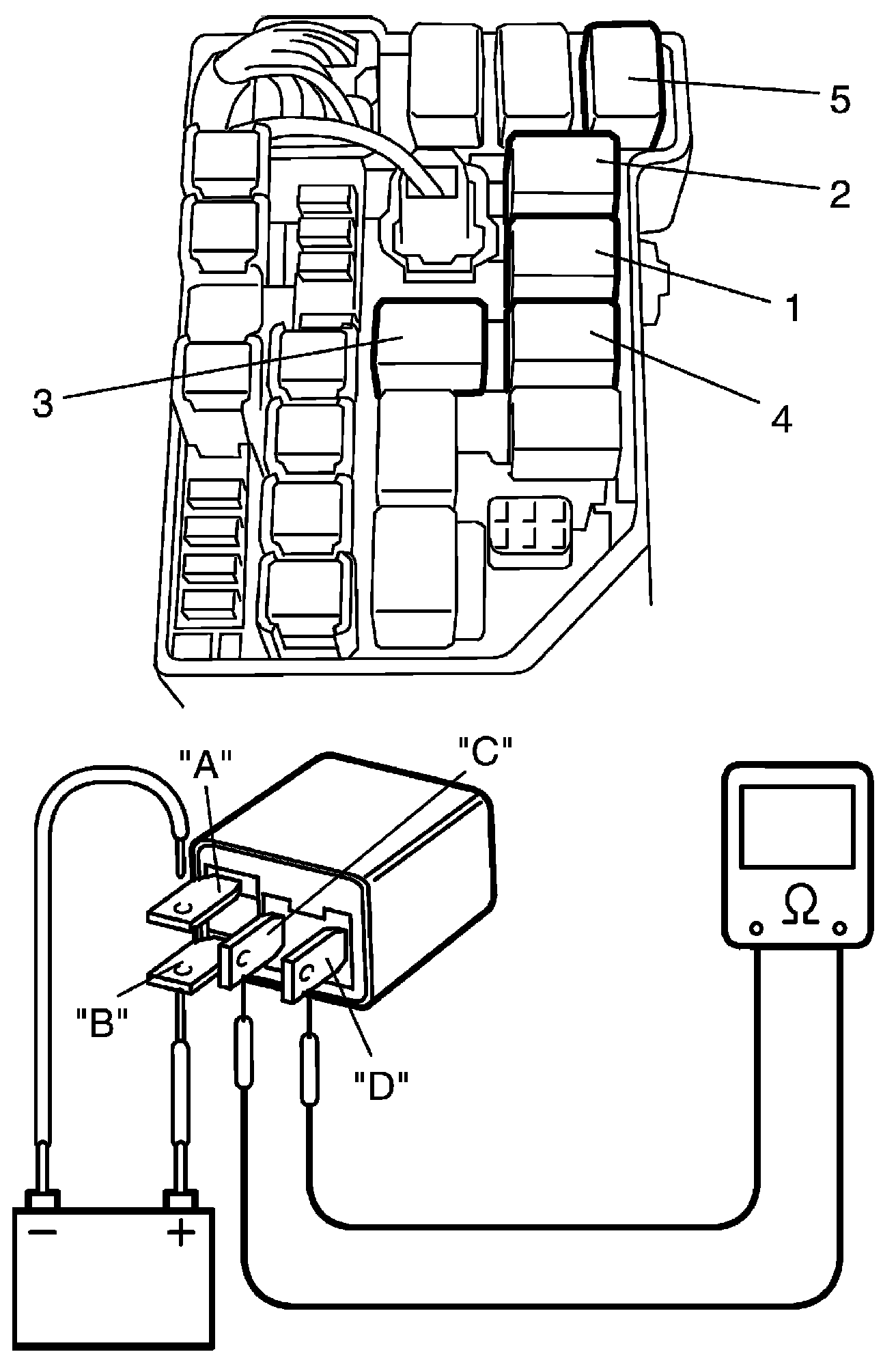 4. Connect battery positive (+) terminal to terminal "B" of relay. Connect battery negative (-) terminal to terminal "A" of relay. Check for continuity between terminal "C" and "D". If there is no continuity when relay is connected to the battery, replace relay.