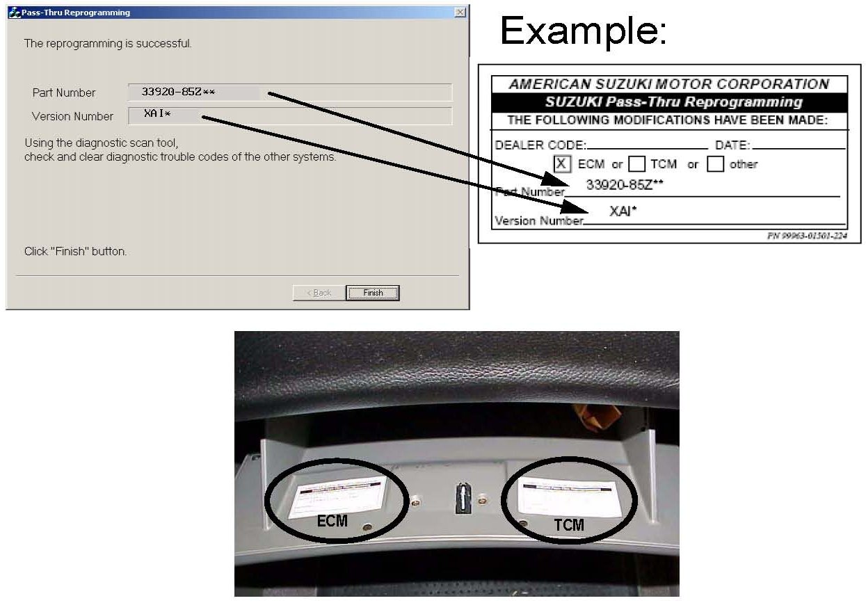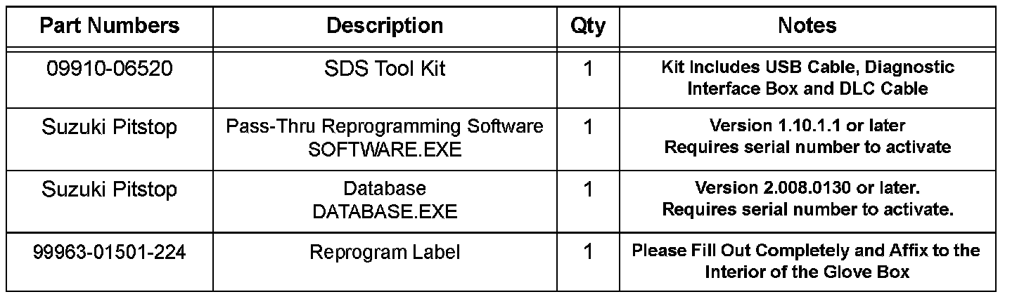 5. Following the procedures outlined in the Suzuki ECU Programming System Operator's Manual, hook up the SDS Interface Tool P/N 09910-06520 to the vehicle and run the ECM reprogramming software. If the message "[4028] ECU already has the latest version" appears, click "OK" and continue to step 6. The glove box label should already be in the glove box.