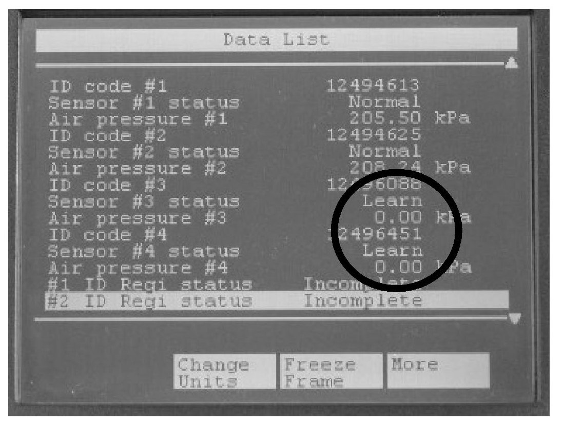 7. If the "Sensor # 1-4 status" shows "Learn" the sensor is not active or the sensor may have been changed and not registered. Please drive the vehicle at 25 m.p.h. to activate the sensors or register the new sensor(s) as required.