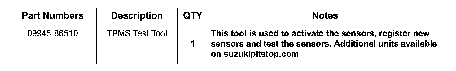 There is a tire pressure sensor located at each valve stem of the wheels NOT including the spare. In order for the TPMS to function properly the sensors need to be activated. This activation is normally completed during PDI by using the Special Tool (09945-86510) and following the procedure described below