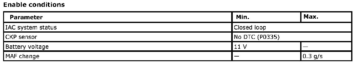 The Idle Air Control (IAC) is functionally checked throttle valve opening by monitoring the loop idle speed comparing with the desired idle rpm. If the idle rpm is higher than the desired idle rpm by 200 rpm or lower than the desired idle rpm by 100 rpm, an IAC malfunction is detected. (P0507, P0506)