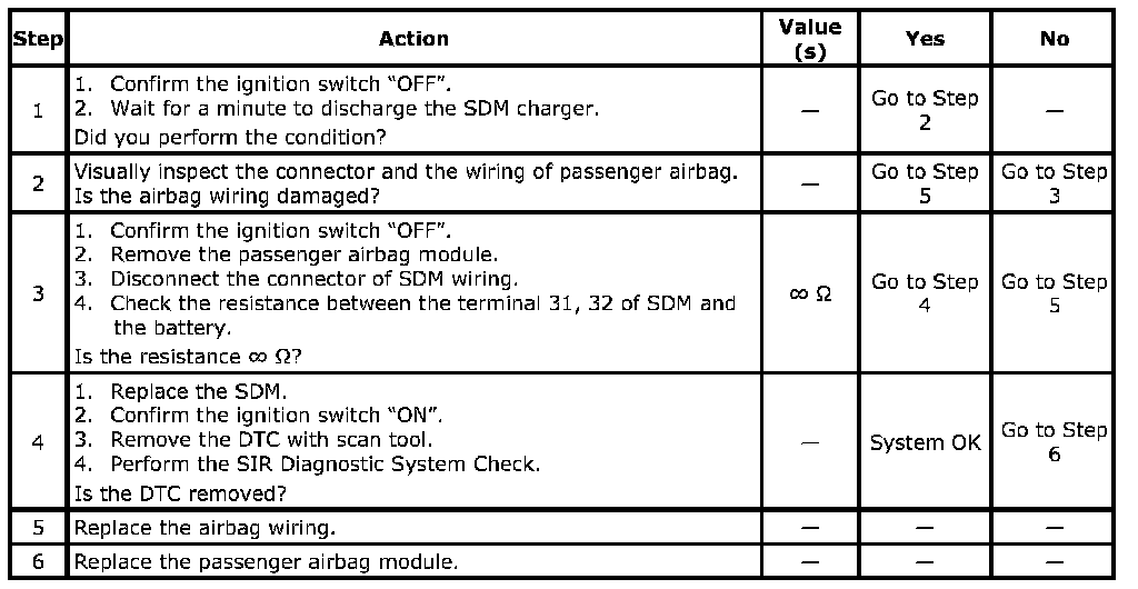 The SDM checks the wiring connection to the passenger airbag module by letting the infinitesimal current flow through the internal circuit and verify the resistance. If the resistance is in the 2 kohms between 10 kohms, the defect may occur depending upon SDM. The normal resistance is over 10 kohms.