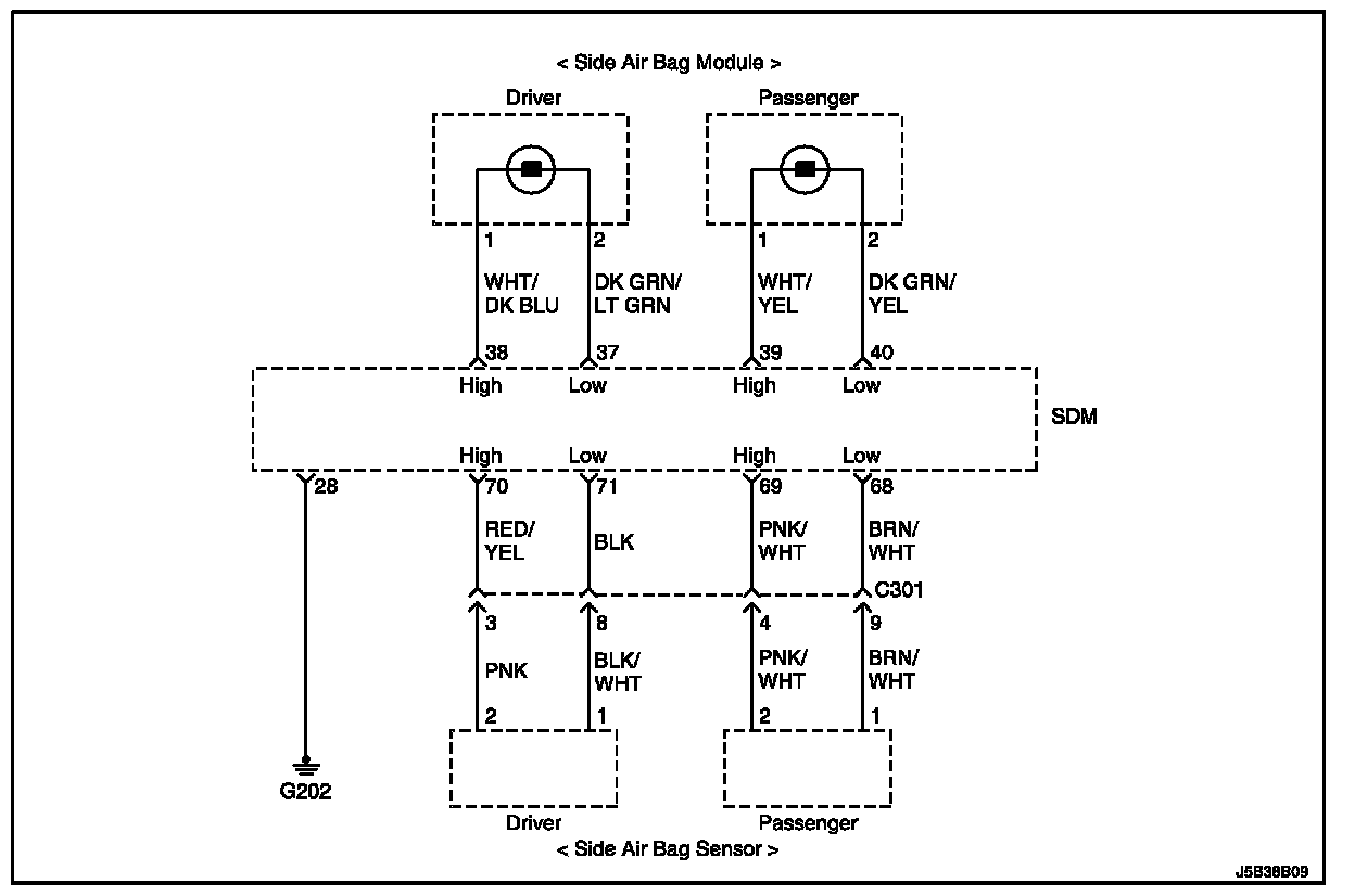 - The side airbag sensor wiring of passenger's high is shorted to battery wiring.